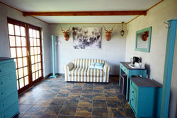 The Nguni house at Buisdoorens is a six sleeper with four single beds and a double bed in the loft. There is a lounge area with a bar fridge and coffee station for that early morning rise or where you can take your shoes off and relax after a long day in the field.